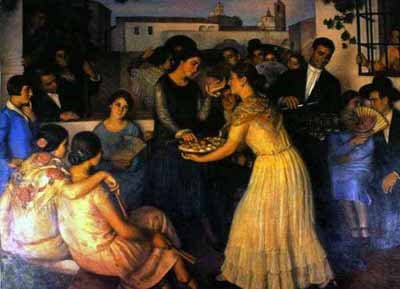 Exterior de la cueva de la Novia, predominan tonos sombríos y plateados. Panorama de mesetas color barquillo,todo endurecido como paisaje de cerámica popular.Las mesas han sido colocadas en el paisaje desértico de grandes chumberas,la criada canta mientras arregla una mesa